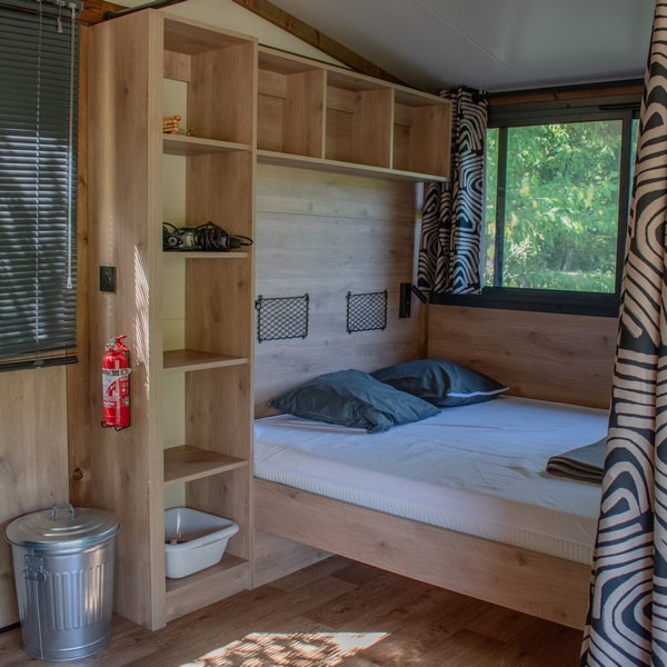 Une chambre avec un lit double (160×200) séparée du séjour par un rideau occultant, une seconde chambre sous le auvent composée d’un lit superposé avec un lit double (140×190) en dessous et un lit simple (90×190) au-dessus (la location ne comprend pas le linge de lit et de toilette).